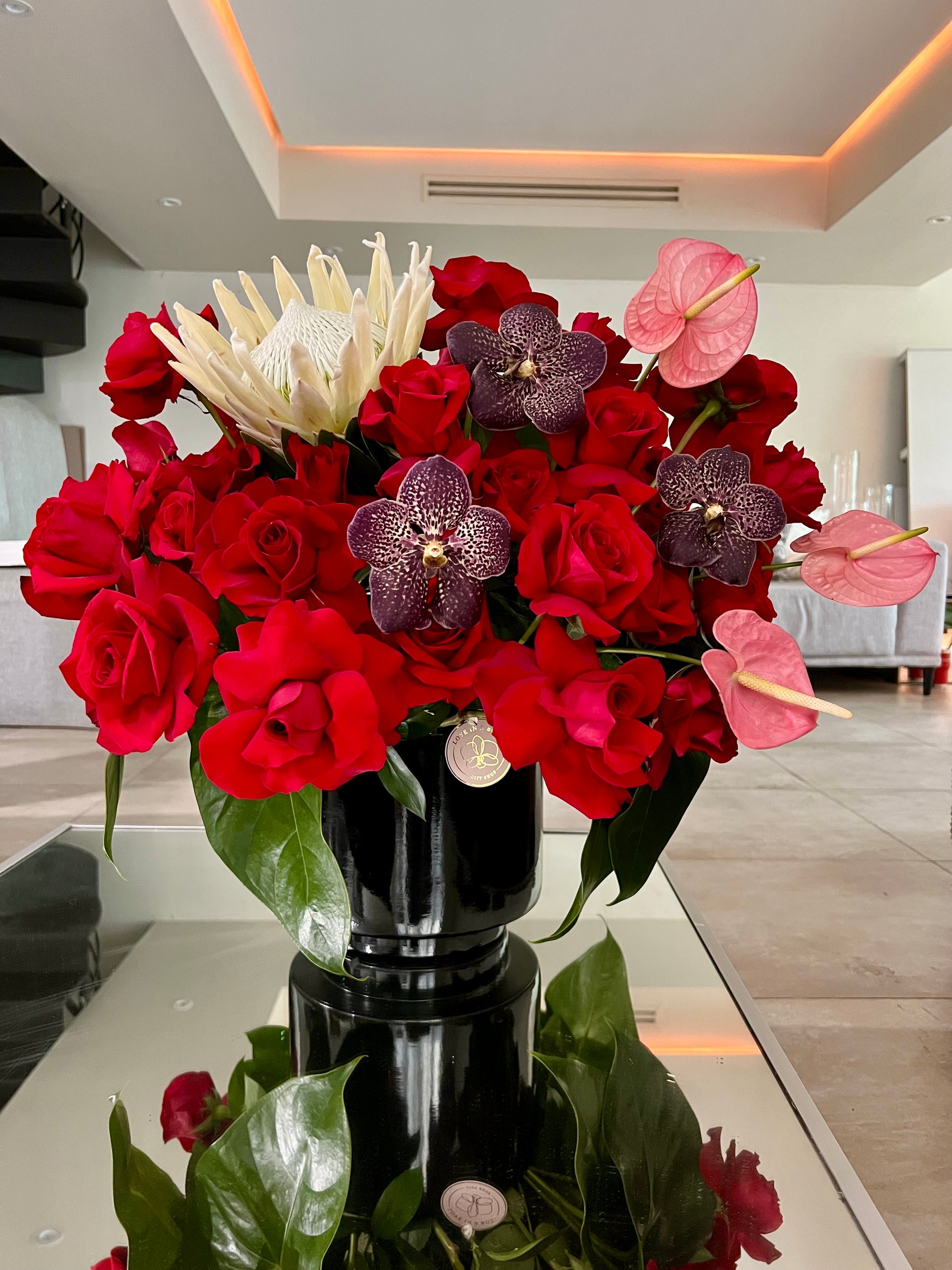King Protea y 50 rosas rojas, anturios y bandas hacen esta perfecta combinación.